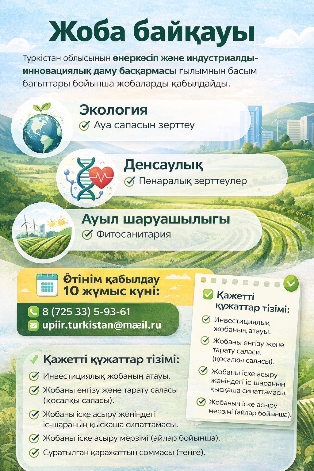 Жобаларды қабылдау мерзімі – хабарландыру жарияланған күннен бастап 10 (он) жұмыс күні.