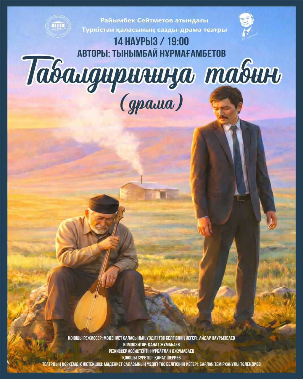 Райымбек Сейтметов атындағы Түркістан қаласының сазды-драма театры көрермен назарына жазушы Тынымбай Нұрмағанбетовтің «Табалдырығыңа табын» драмасын ұсынады.